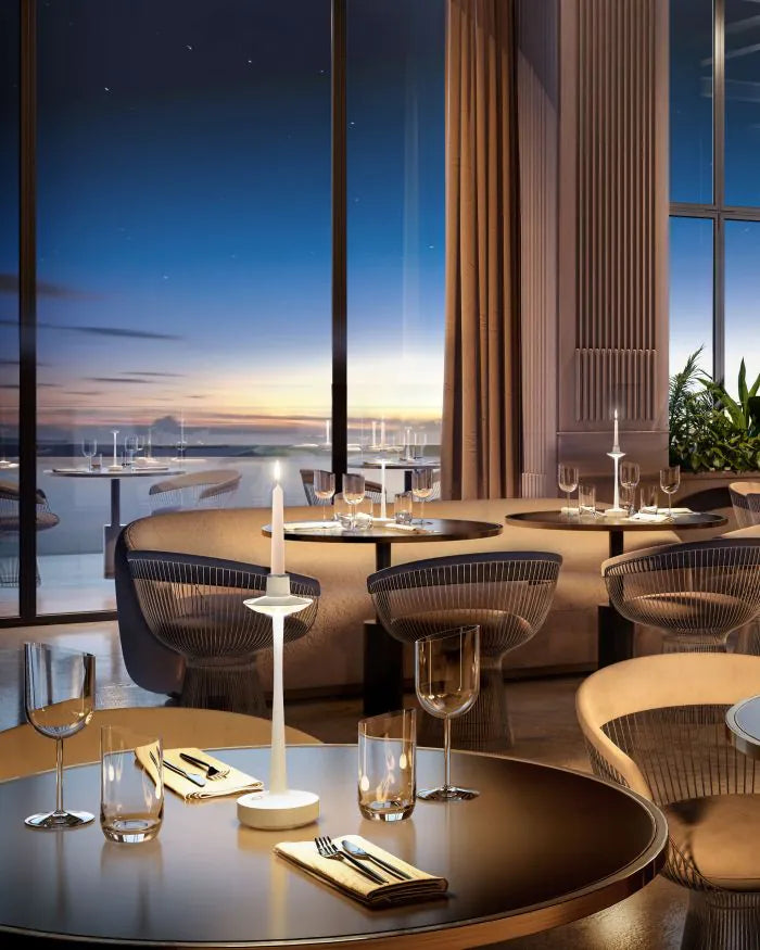 Villeroy & Boch presents the Aarhus Table Lamp with Candle Holder as a 3-in-1 option with practical artificial light and a removable silicone attachment that supports a candlestick. You can use it as a table lamp, candle holder, or together to achieve your preferred ambient lighting and intimate setup. Additionally, it will pair nicely with the Bordeaux Wine Cooler with Light for a tasteful nightcap.