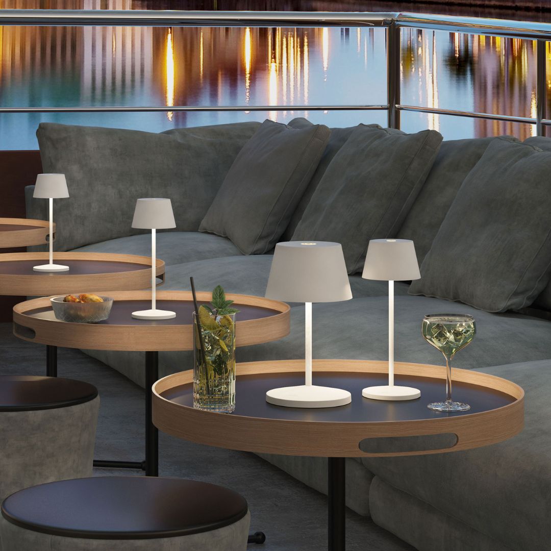 The dimmable table lamp Seoul by Villeroy & Boch. Available in matte and glossy finishes. Made of coated aluminium it looks equally at home in the garden or at your restaurant table. Thanks to the IP65 protection class, the small lamp is an all-rounder for every occasion. The built-in, infinitely variable touch dimmer on the top of the luminaire makes it easy to change the light intensity and colour temperatures.